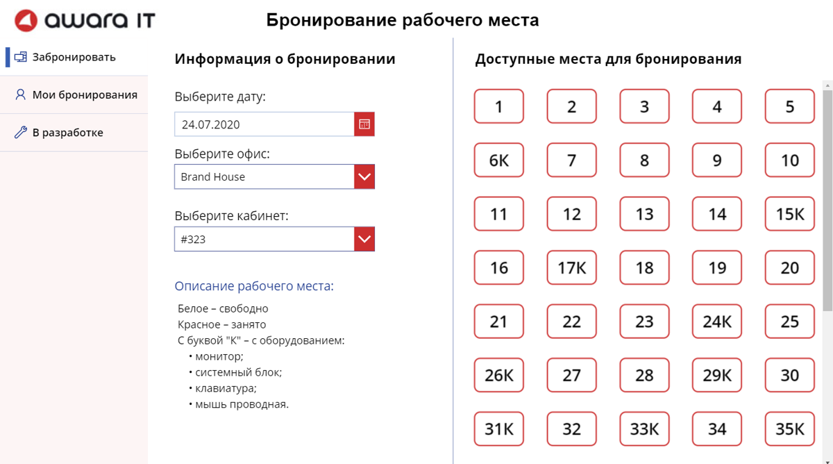Приложение на базе Power Apps. Через него пользователи гарантированно получают свободное место в офисе, с нужным оборудованием и характеристиками. Помогает соблюдать законодательство (рекомендации Роспотребнадзора по разделению рабочих потоков сотрудников).